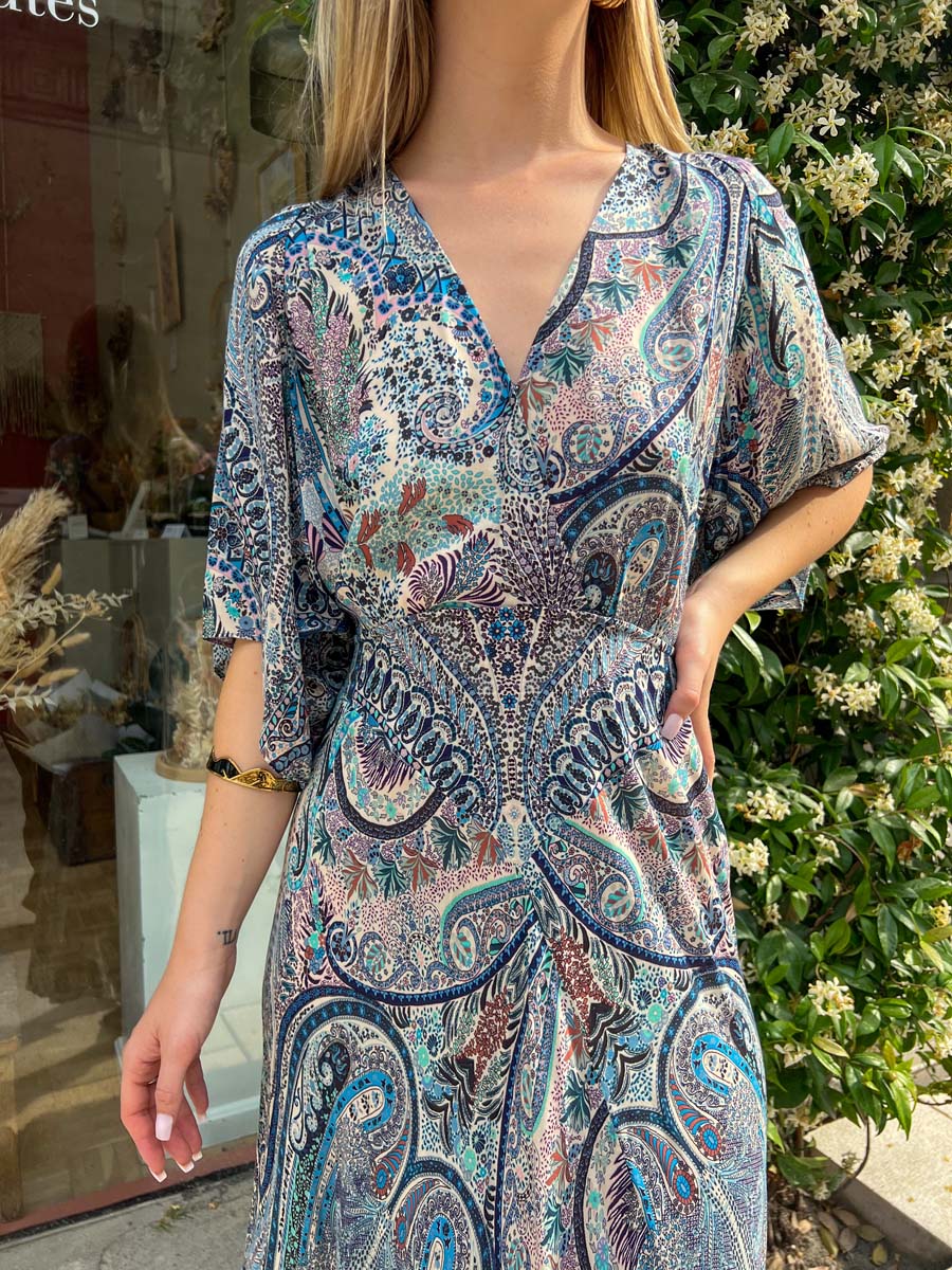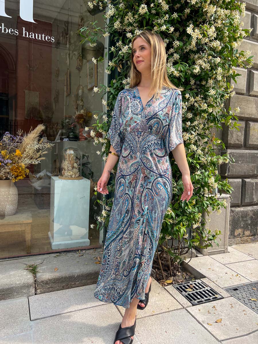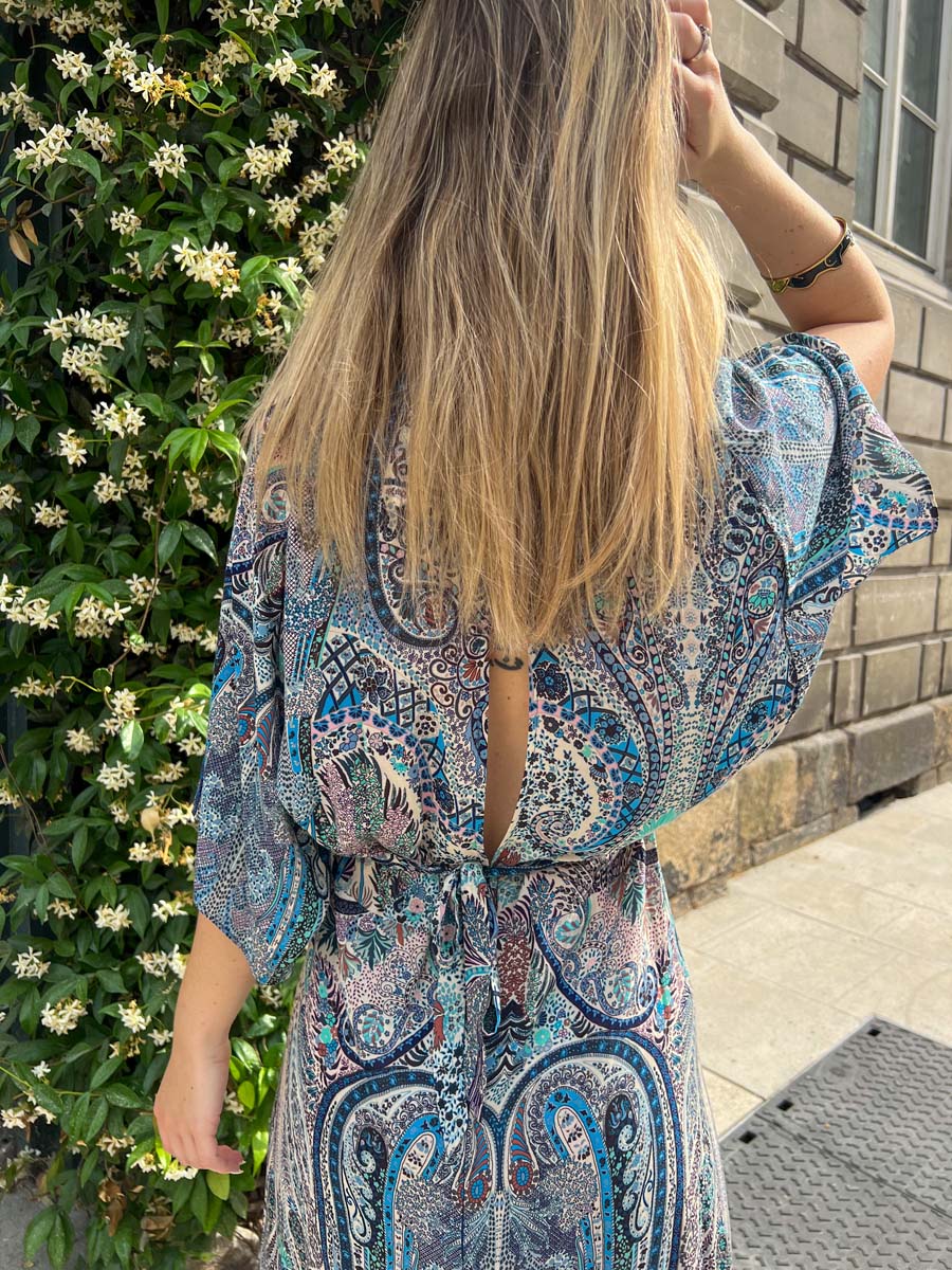 La couleur principale de la robe est le bleu, ce qui ajoute une note de fraîcheur et de douceur à l’ensemble. Puis, elle s’inspire de l’esthétique orientale et bohème, invitant au voyage et à l’évasion.